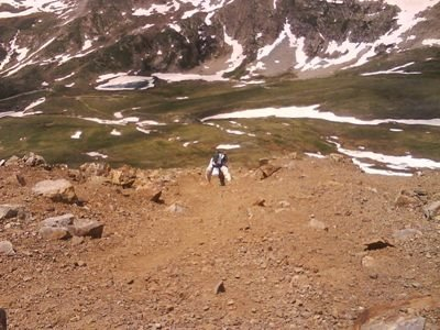 Then I said that the original bend that I figured it was, was likely it. Having read reports on the forum with the photo uploading issues, I knew it would be a bad road, but I knew that it would not END. So, we forged on. Then we were behind a guy in a pickup who was backing up really fast. Now, we had prior to then been in some water (snowmelt) and also had rocks jutting into our road as well, but we had not encountered other vehicles. I got out and talked to him and he said that he didn’t have enough clearance. After we watched the bizarre way that he backed out of the road, we thought, “Let’s try it.” And we did. A little bit of up and down, but no switchbacks or times in which you want a guardrail so bad that you’d rather just get out of your car. But, that’s these two: