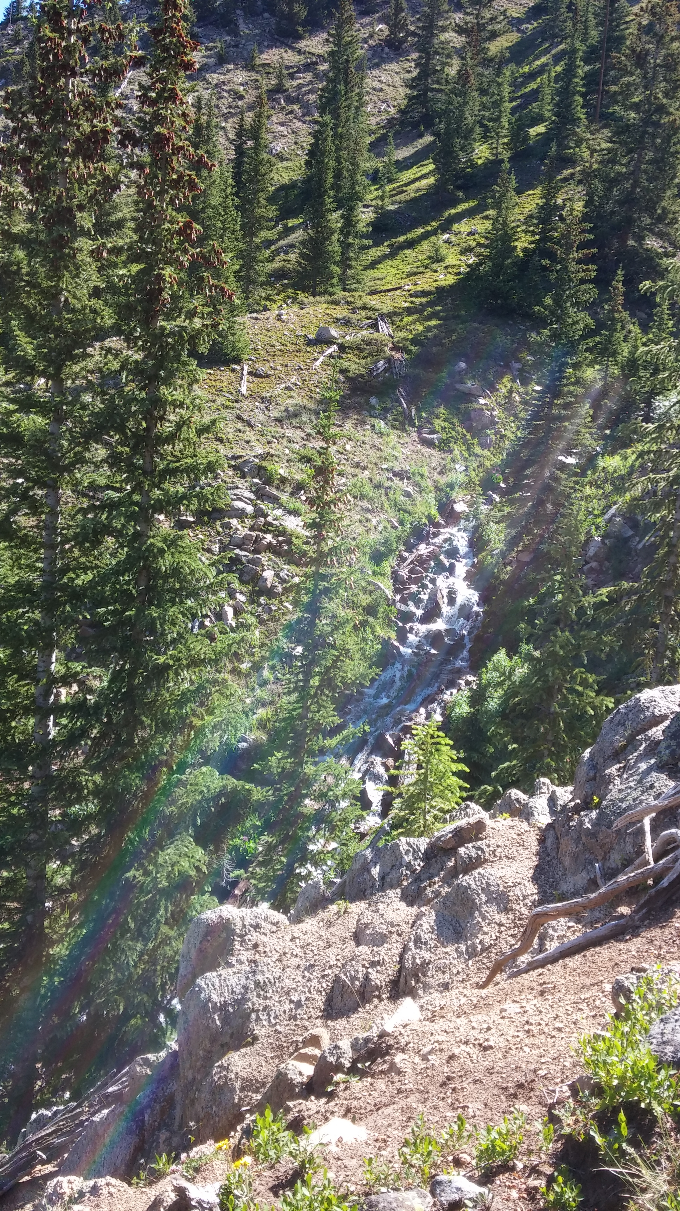 The only problem now was that it was 11:30, and you really should be off mountain tops by noon. It’s not safe. We could see some clouds to the north and some way in the south. I was most worried about the latter. So, although we had really made good time, we had to redouble our efforts and we did. I took few pictures, but am including this one so you can see a cool part of the trail. I took it on our descent, but am at this point visually as I write.